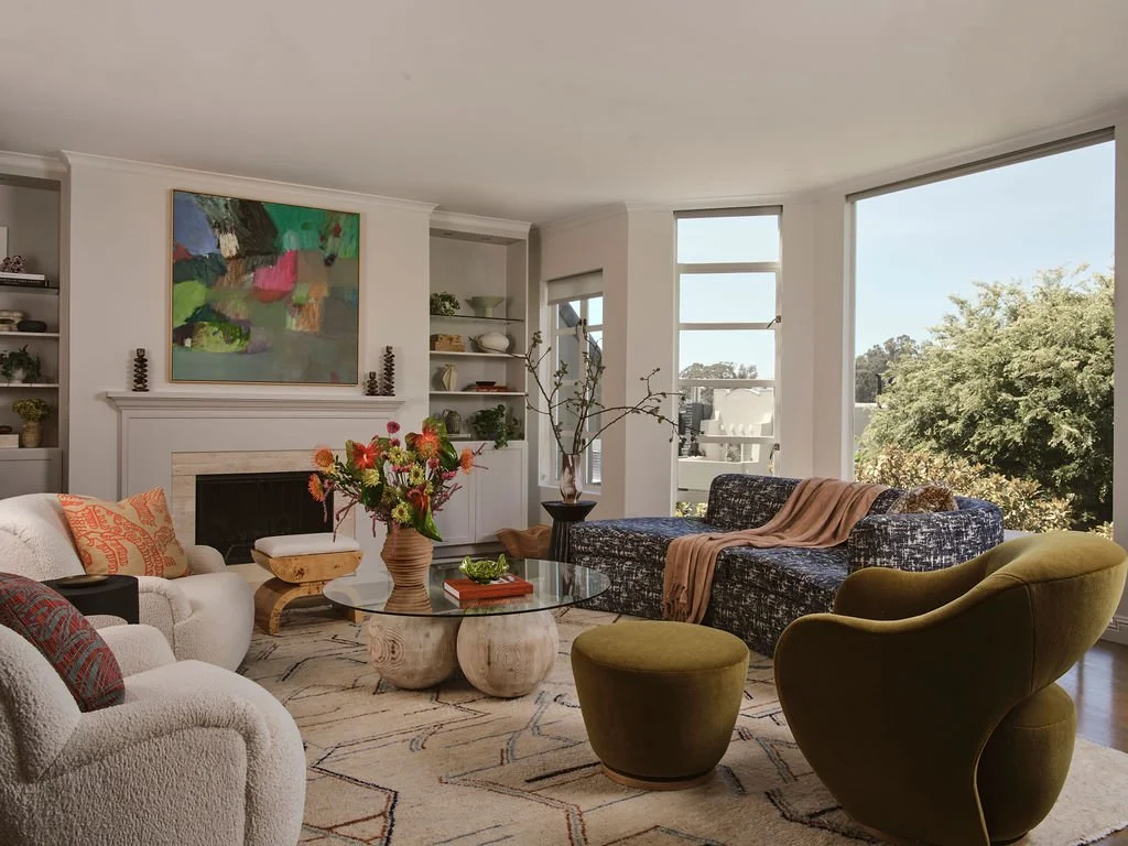 Framing remarkable views of the Palace of Fine Arts and the Golden Gate Bridge, her home inspired a worldly and cultured sensibility that influenced the furnishing and palette selections giving the home a timeless San Franciscan quality. Through a combination of modern elements and vintage finds, the home achieves a harmony that feels original while echoing classic influences.